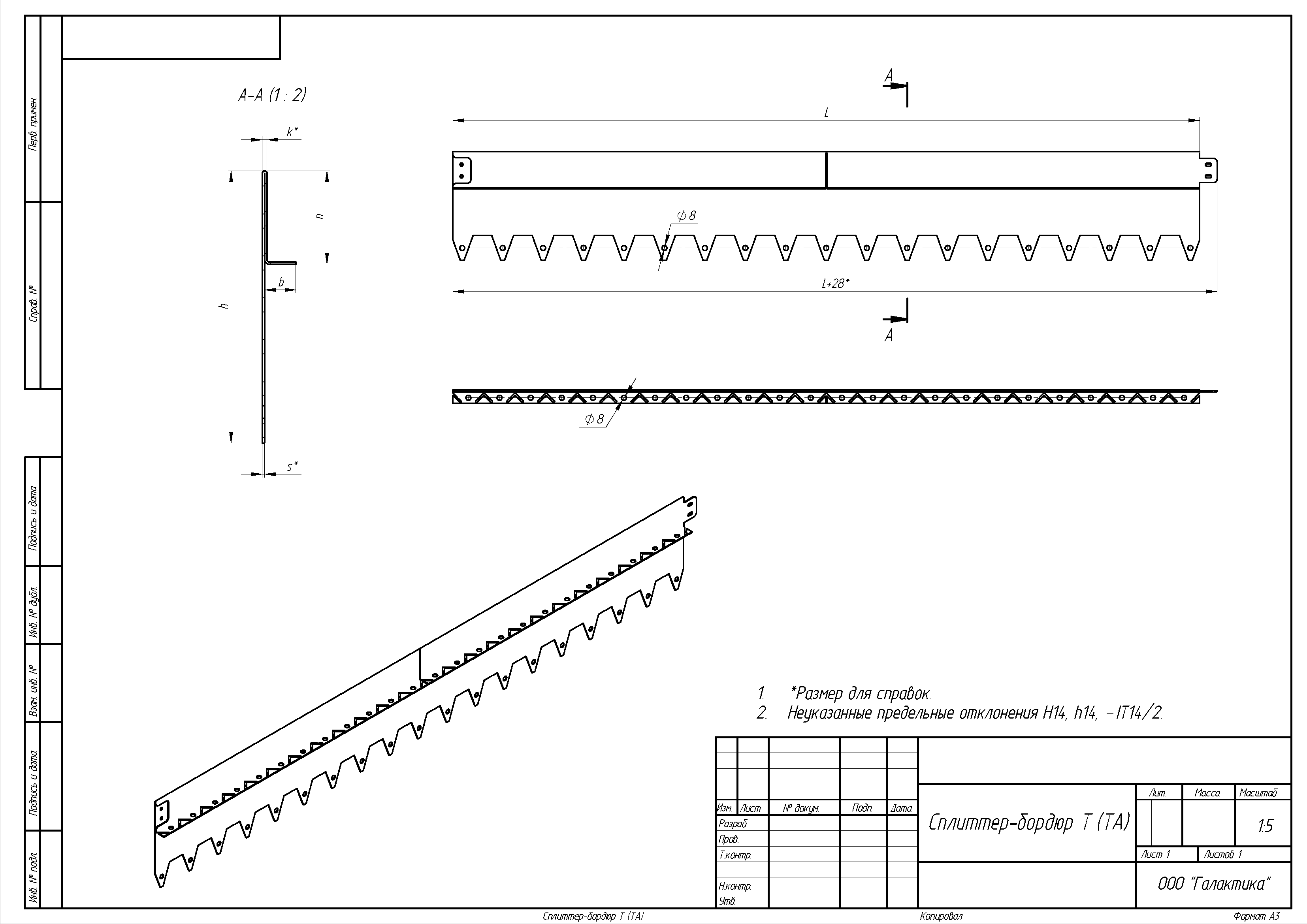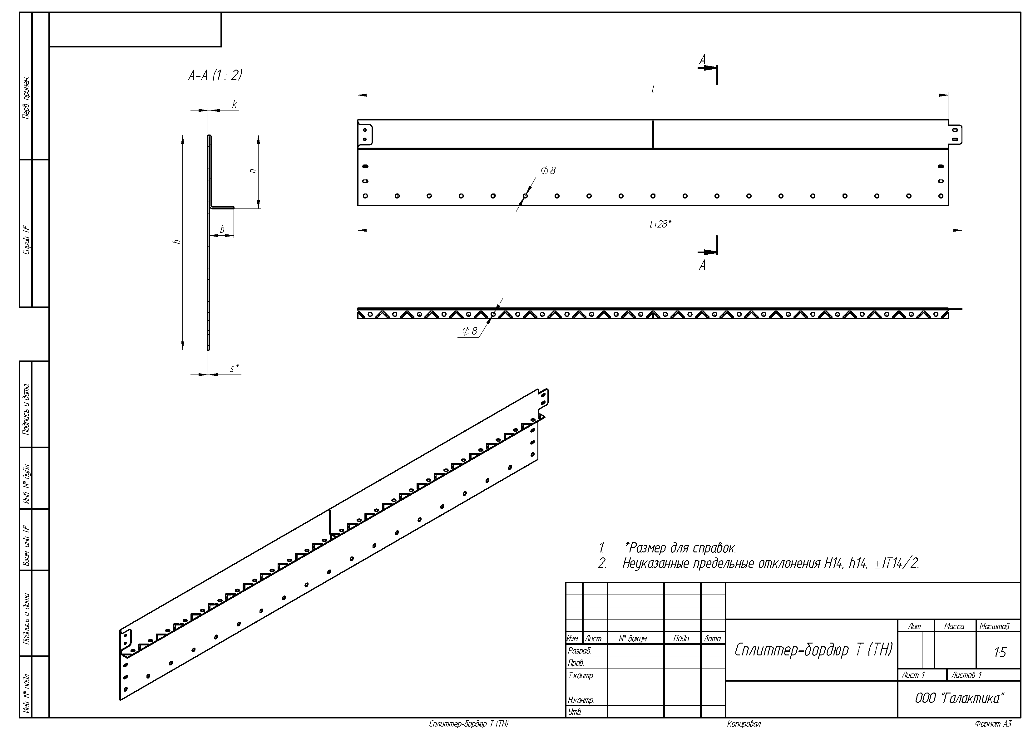 Сплиттер-бордюр металлический Т-образный БМ/БС-150*40*1200*1,5Оцинкованная сталь